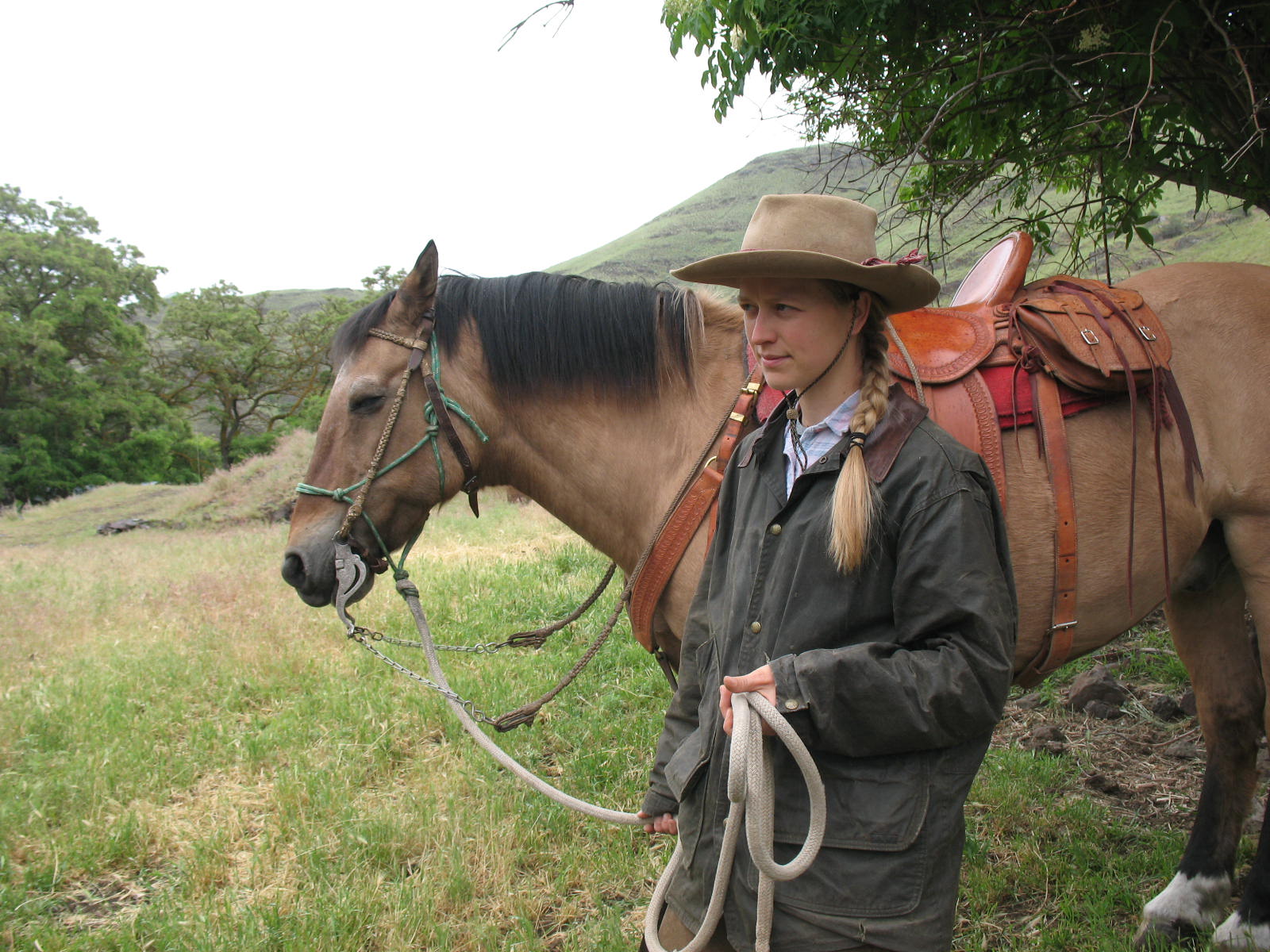 | Sara putting on her chinks |